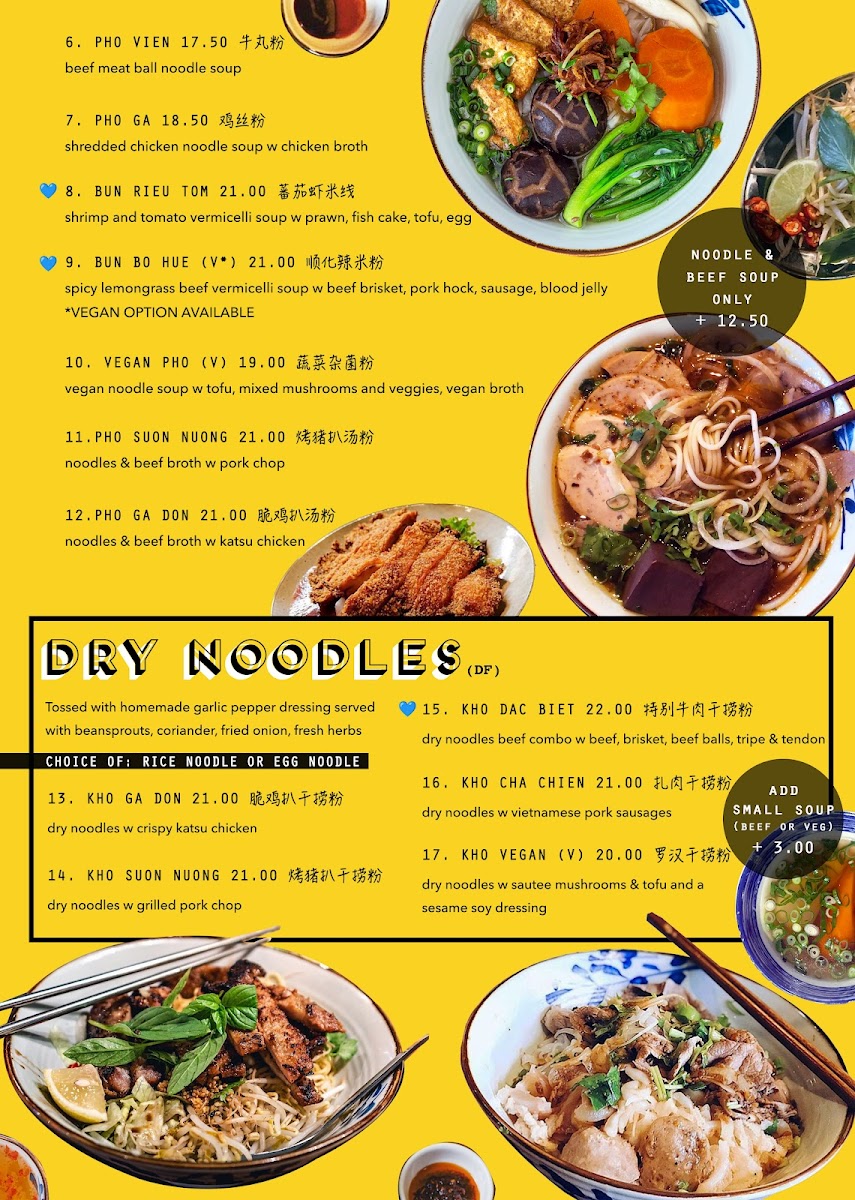 Noodle and soup with grilled pork chop. Our beef broth is made with beef Spare Rib slowed cooked for 12 hours, served with rice noodles, onions, shallots, coriander, bean sprout, fresh herbs, lemon, chilli and hoisin sriracha sauce.